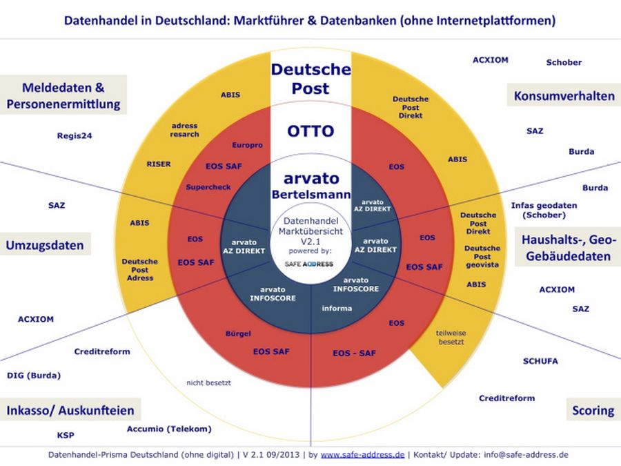 DatenquellenÖffentliche Quellen (Landes-Vermessungsämter), Kooperationspartner (Deutsche Post Adress, TNS Infratest, GfK, F&B, Infoscore, Callcredit Group, microm, beDirect, Arvato Financial Solutions, IFH Köln)