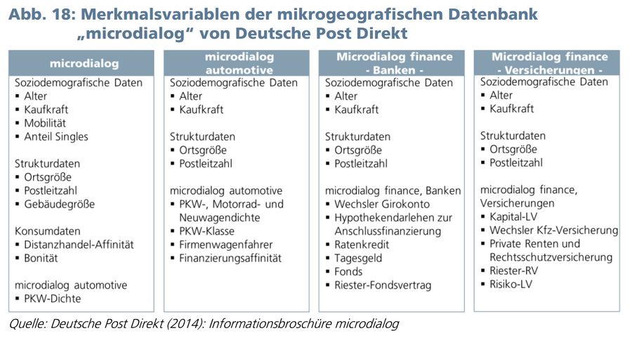Zu den Analysevariablen zählen sozidemografische Daten, Strukturdaten sowie Konsumdaten. Für die Branchen Automotive, Banken und Versicherungen bietet die Deutsche Post Direkt weitere spezifische Informationen auf der mikrogeografischen Ebene an, bspw. über die PKW-Dichte oder Girokonto-Wechsler. Darüber hinaus kooperiert die Deutsche Post Direkt mit dem Internetmarktplatz eBay und bildet mittels anonymisierter Transaktionsdaten insgesamt 22 sog. Sortimentsaffinitäten ab, bspw. Garten und Heimwerken, Uhren und Schmuck oder Wellness. Diese enthalten Informationen über die zuletzt getätigten Käufe (12 Monate und 24 Monate) oder den durchschnittlichen Bestellwert der Konsumenten in den jeweiligen Segmenten. (>>)