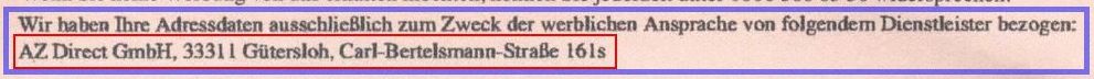 Aus dem Kleingedruckten erfahren wir, dass es offensichtlich „Dienstleister“ gibt, die meine Adressdaten OHNE meine Zustimmung, OHNE mich zuvor in irgendeiner Art und Weise kontaktiert zu haben, „zum Zwecke werblicher Ansprache“ an interessierte Werbetreibende veräußern.