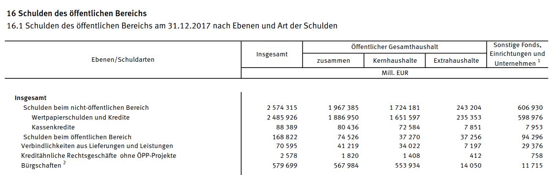 Die „Schulden des öffentlichen Gesamthaushalts“ entsprechen denjenigen Schulden, welche allenthalben öffentlich bzw. in den Medien zitiert bzw. aufgezeigt werden, wenn es um „Staatsverschuldung“ geht.