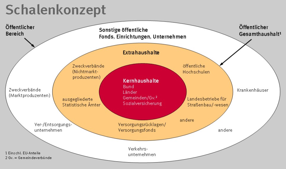 Um die Vergleichbarkeit der öffentlichen Haushalte wiederherzustellen, müssen zusätzlich zu den Kernhaushalten auch die Schulden der FEU, die in rechtlich selbständiger oder unselbständiger Form mit eigenem Rechnungswesen geführt werden, berücksichtigt werden. Dies geschieht in einem ersten Schritt durch die Integration der Schulden der Kernhaushalte des Bundes, der Länder und der Gemeinden/Gv. mit ausgewählten öffentlichen Fonds, Einrichtungen und Unternehmen, die nach den Kriterien des Europäischen Systems Volkswirtschaftlicher Gesamtrechnungen (ESVG`95) dem Sektor Staat zuzurechnen sind. In einem zweiten Schritt erfolgt die Ausweisung des gesamten öffentlichen Sektors. Dieser umfasst neben den Einheiten des öffentlichen Gesamthaushaltes auch alle übrigen FEU mit eigenem Rechnungswesen, die nicht zum Sektor Staat zählen.