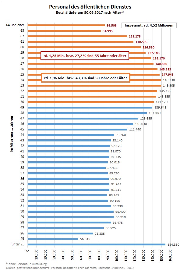 personal des öffentlichen dienstes nach alter 2017Äußerst bedrohliche Verhältnisse, welche sich zukünftig sogar noch weiter verschlechtern werden. In den nächsten zehn bis zwanzig Jahren werden brutto überschlägig zusätzlich ein bis zwei Millionen Beschäftigte des öffentlichen Dienstes zu Versorgungsempfängern (siehe nebenstehende Graphik „Personal des öffentlichen Dienstes nach Alter“).