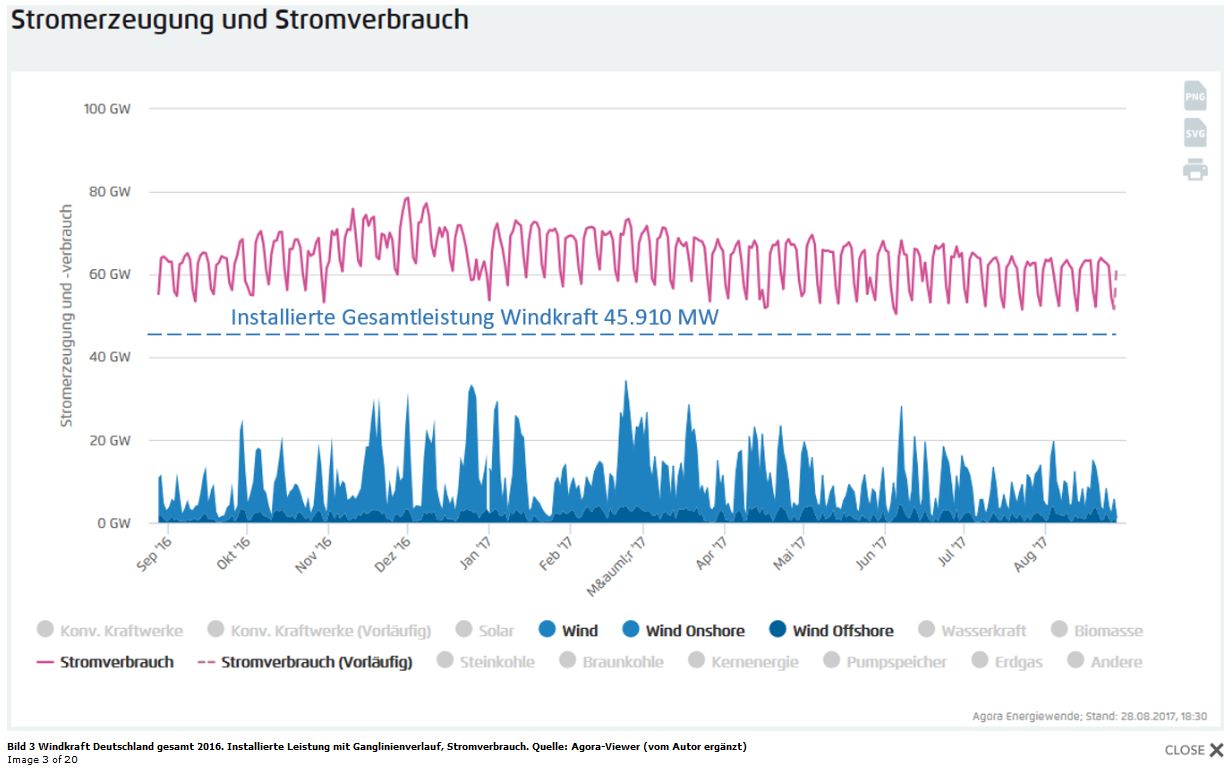 Weitere Links: „Offshore lieferte jeden Tag Strom und onshore gab es im Jahr 2016 deutschland­weit keine einzige Stunde ohne Windstrom­erzeugung“   |   „Strukturelles Missverhältniss zwischen Kapazität und tatsächlicher Leistung“